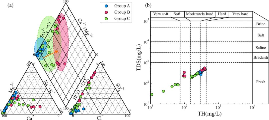 图3 (a)Piper三线图;(b)TDS vs. TH