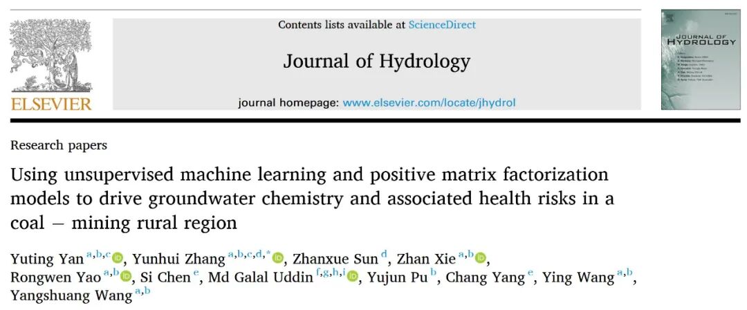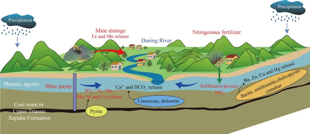 识别和量化地下水中重金属和硝酸盐的地质来源及人为来源,对保障矿区农村地下水环境安全至关重要。然而,目前尚未提出用于阐明矿区农村地下水化学特征、特定污染物来源及相关概率健康风险的综合方法。本研究采用无监督机器学习、基于主成分分析的成分数据分析、正定矩阵因子分解和蒙特卡洛模拟健康风险等方法,对中国西南部重庆东北部某煤矿区的污染物来源及地下水饮用适宜性进行了量化分析。本研究有望为矿区农村地区的地下水可持续管理提供可靠且有力的依据(图1)。
