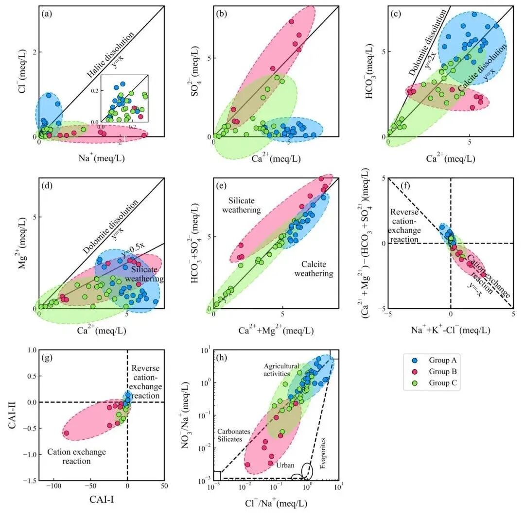 图4 离子比例图(a)Cl− vs. Na+,(b)SO42− vs. Ca2+,(c)HCO3− vs. Ca2+,(d)Mg2+ vs. Ca2,(e)HCO3−+SO42− vs. Ca2++Mg2+(f)(Ca2++Mg2+)–(HCO3−+SO42−)vs. Na++K++Cl−,(g)CAI−II vs CAI−I,(h)NO3−/Na+ vs. Cl−/Na+
