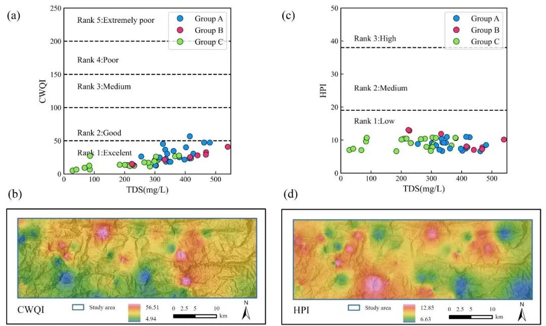 图7 (a)CWQI vs. TDS,(b)CWQI空间分布图,(c)HPI vs. TDS和(d)HPI空间分布图