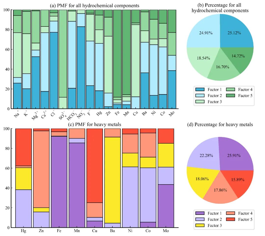 图6 PMF解析结果(a)所有水化学组分的PMF解析结果,(b)所有水化学组分的5个因子的源贡献,(c)重金属的PMF解析结果,(d)重金属的5个因子的源贡献