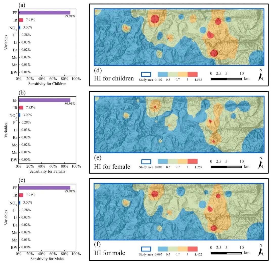 图9 (a)儿童、(b)女性和(c)男性的敏感性分析和(d)儿童、(e)女性和(f)男性的健康风险空间分布