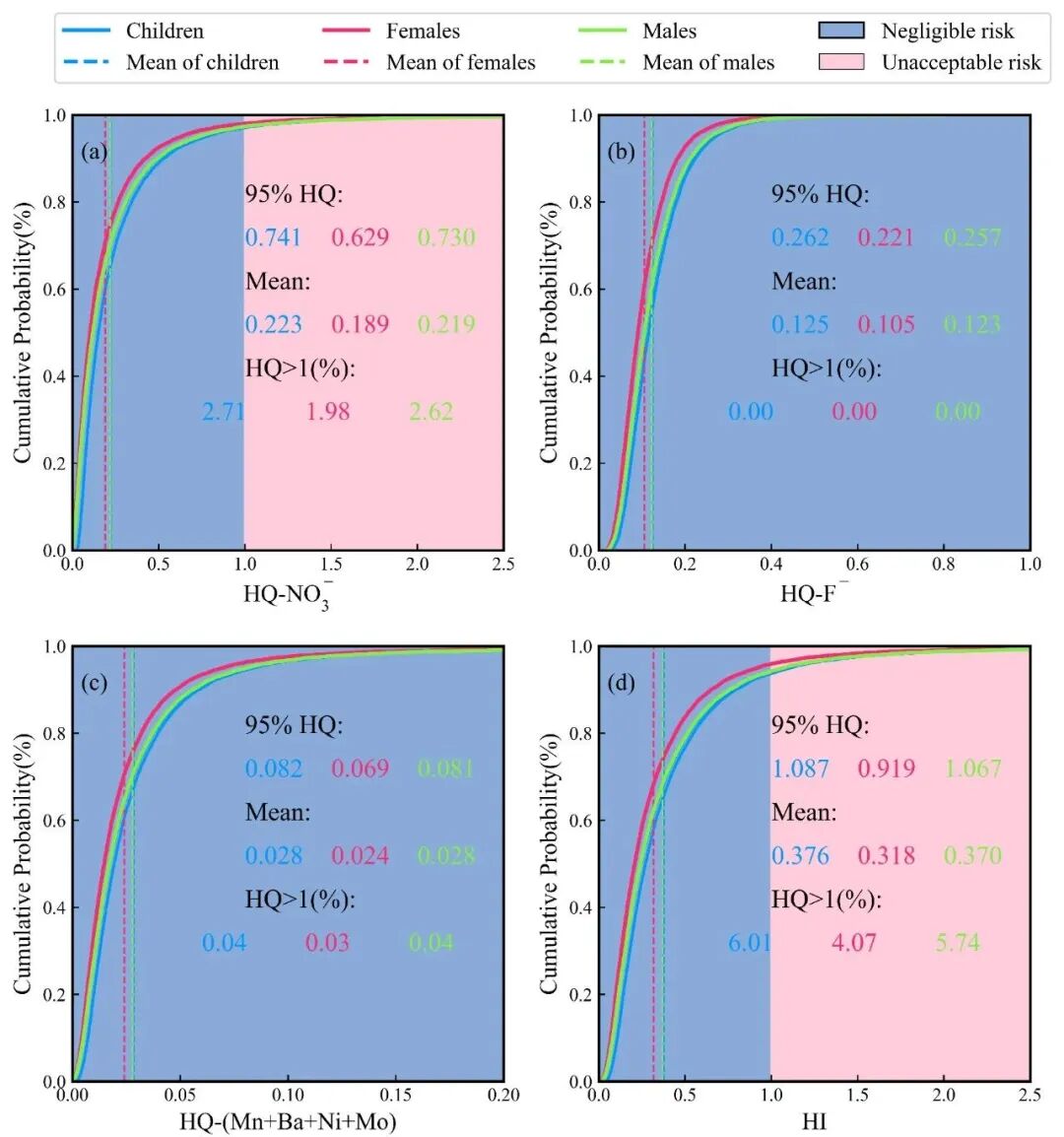 图8 (a)NO3−、(b)F−、(c)重金属(Mn+Ba+Ni+Mo)和(d)所有风险组分的健康人体风险评估
