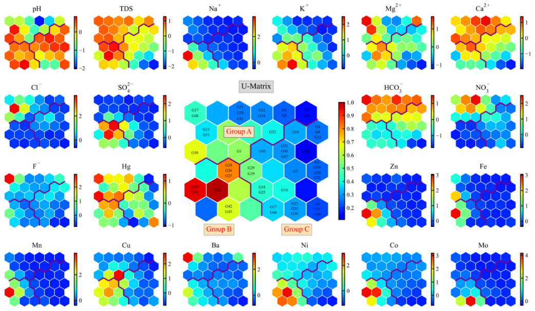SOM模型与K-means将地下水样本分为三类,A组包括20个样本,B组包括8个样本,C组包括23个样本(图2)。三组样本在水文地质图上的位置表现出显著差异,A组为“碳酸盐岩型”,B组为“碎屑岩型”,C组为“混合岩型”。这证实了SOM模型的分类结果与研究区含水层岩性紧密吻合。