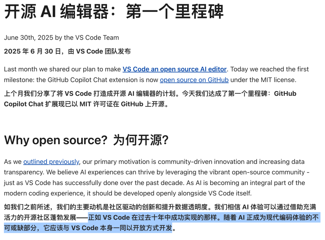 VS Code 团队说道:“我们相信 AI 体验可以通过借助充满活力的开源社区蓬勃发展 —— 正如 VS Code 在过去十年中成功实现的那样。随着 AI 正成为现代编码体验的不可或缺部分,它应该与 VS Code 本身一同以开放方式开发。”