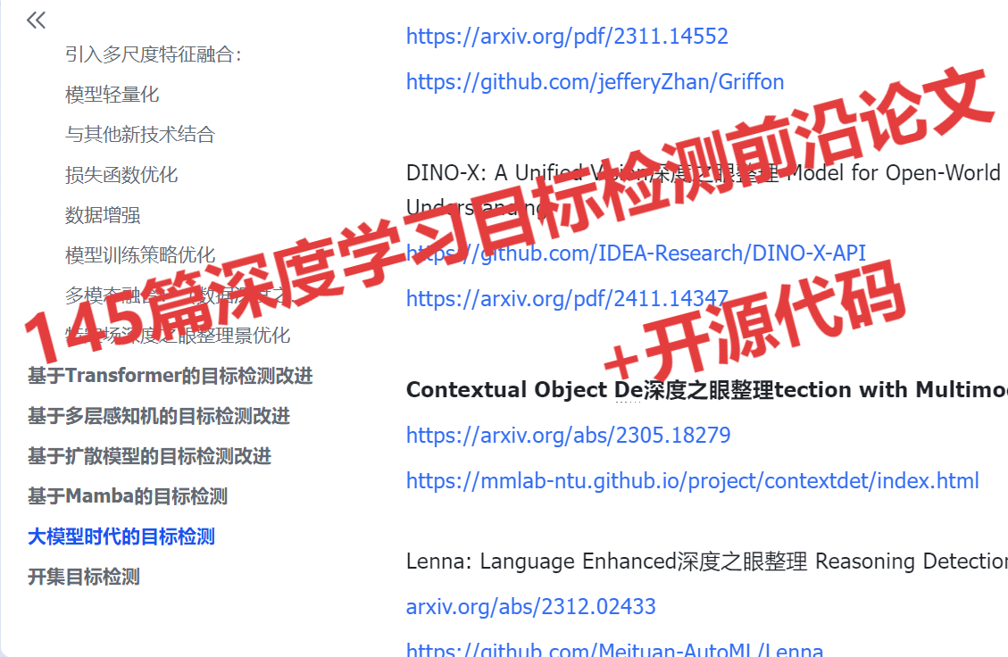 再有就是大模型时代下的目标检测,比如SAM+目标检测就是个典型...其余推荐由于文章限制就不一一展开了,配上145篇目标检测参考论文,我都统一打包完毕,分享给大家,尤其是无GPU无指导的单兵们,希望可以有所帮助。