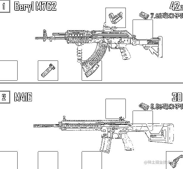 屏幕截图处理后如上,在装备识别之前,我们需要先准备很多素材图片用来对比。比如:武器名、枪托、握把、枪口
