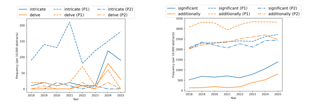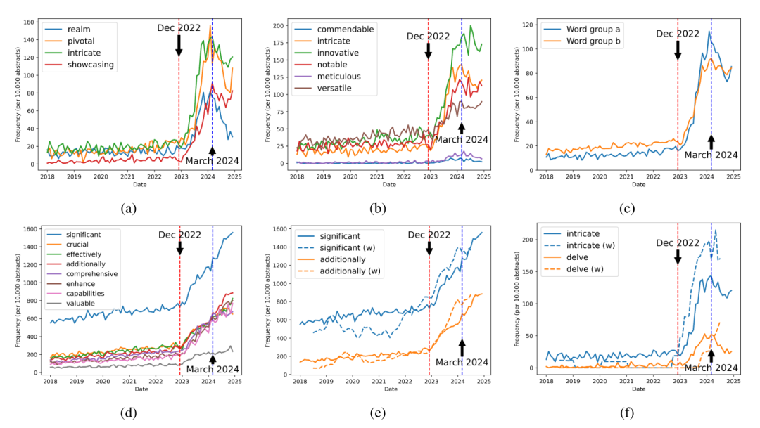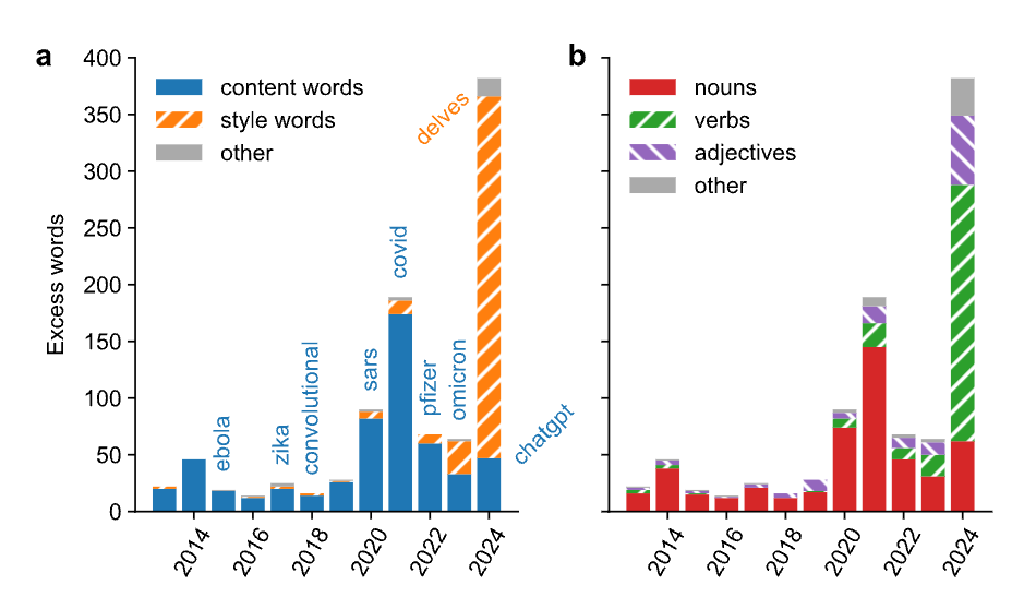 实验发现,在2024年以前,类似“coronavirus” 的名词被超额使用;2024年之后,则以“intricate”、“notably” 等与研究内容无关的风格词为主,其中66%都是动词(如 “delving”、“emphasizing”),16%为形容词(如 “crucial”、“pivotal”)。