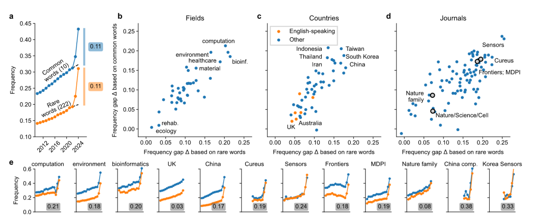 一些低门槛的开放获取期刊,如MDPI旗下的《Sensors》,LLM可达24%,而像《Nature》、《Science》等顶刊只有6%到8%,研究人员推测,可能是由于前者审稿流程相对简化,而作者需要依赖LLM快速成文。