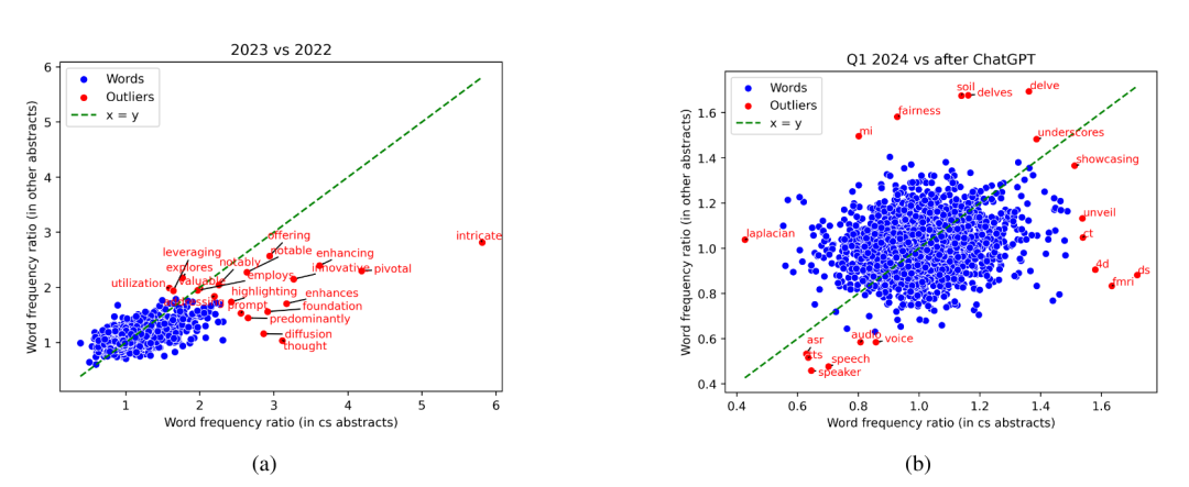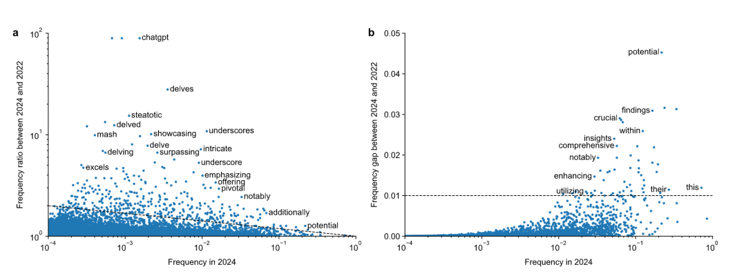 研究发现,一些像“delve”、“intricate” 这类已经被明确指出是ChatGPT的常用词汇,自2024年4月起使用频率显著下降。