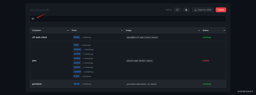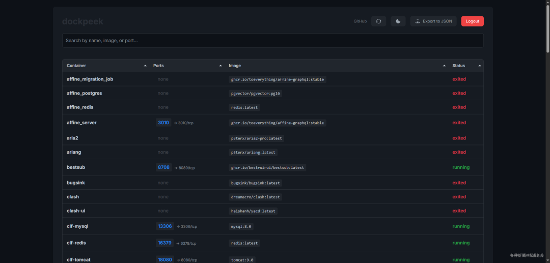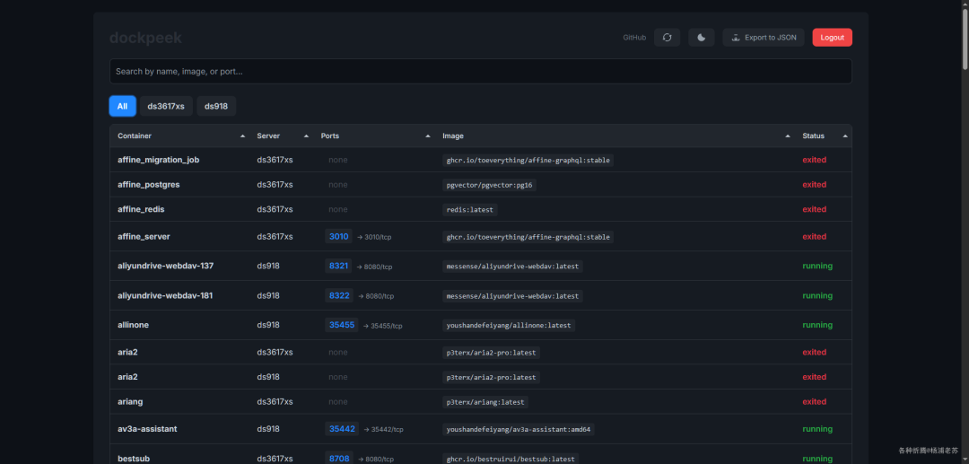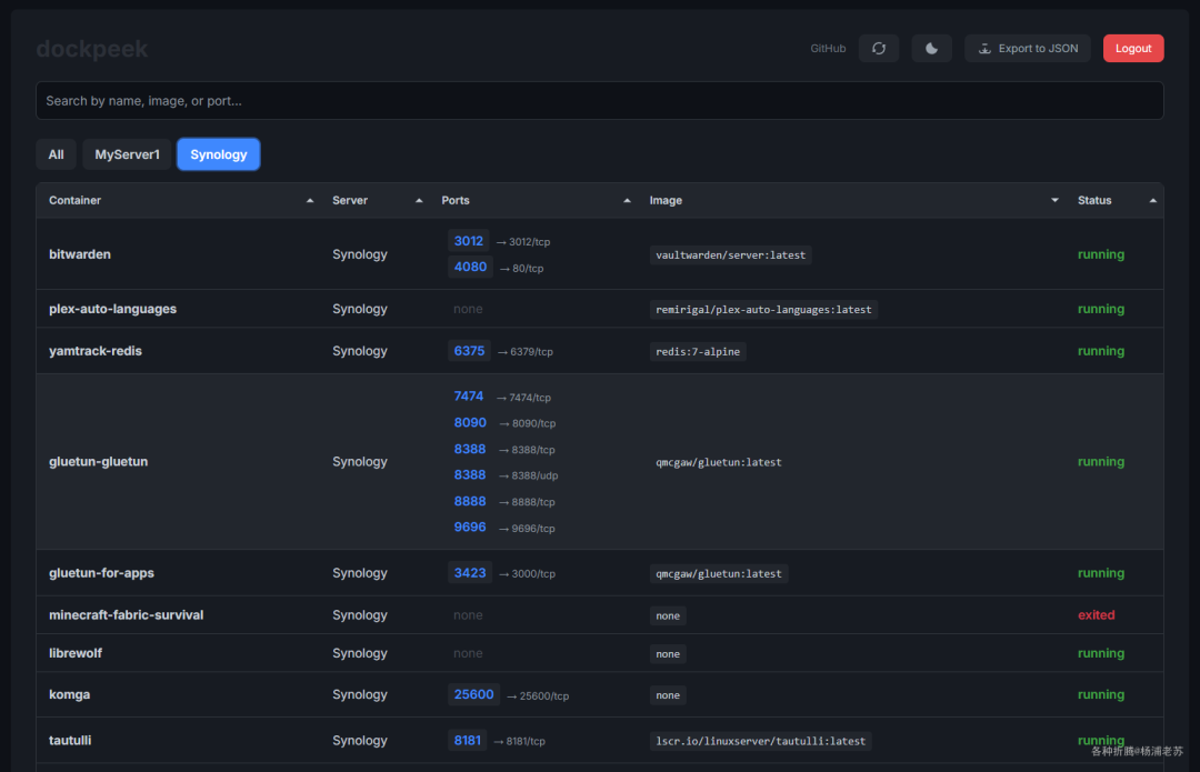 services: dockpeek: image:ghcr.io/dockpeek/dockpeek:latest container_name:dockpeek restart:unless-stopped ports: -"8644:8000" volumes: -/var/run/docker.sock:/var/run/docker.sock environment: -SECRET_KEY=my_secret_key# Set secret key -USERNAME=admin# Change default username -PASSWORD=admin# Change default password # Docker Host 1 -DOCKER_HOST_1_URL=unix:///var/run/docker.sock# Required for DOCKER_HOST_N: URL of the additional Docker host. -DOCKER_HOST_1_NAME=ds3617xs# Required for DOCKER_HOST_N: Display name shown in the UI. -DOCKER_HOST_1_PUBLIC_HOSTNAME=# Optional: Public hostname or IP for clickable links. If empty, inferred from the URL. # Docker Host 2 -DOCKER_HOST_2_URL=tcp://192.168.0.199:2375# Required for DOCKER_HOST_N: URL of the additional Docker proxy. -DOCKER_HOST_2_NAME=ds918# Required for DOCKER_HOST_N: Display name shown in the UI. -DOCKER_HOST_2_PUBLIC_HOSTNAME=# Optional: Public hostname or IP for clickable links. If empty, inferred from the URL. # Example: Use device name like 'NAS' for easier access via Tailscale.