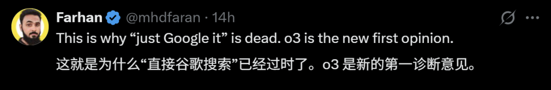 这就是为什么「just Google it」(直接谷歌搜索)已经过时了,o3是新的第一诊断意见。