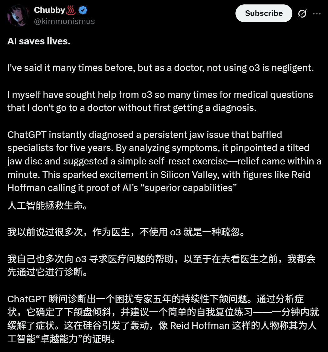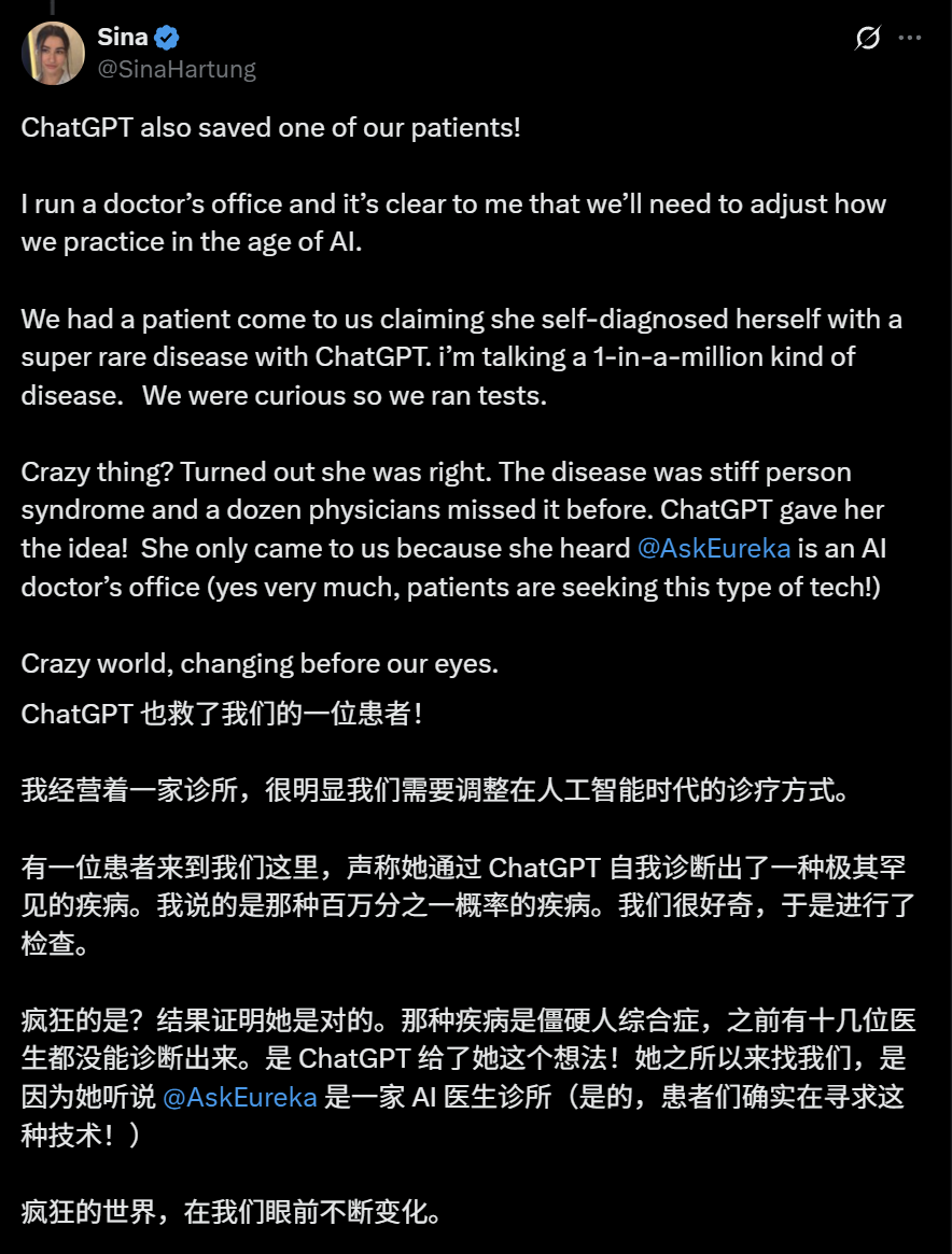 X上另一位医生分享,她经营一家诊所,AI的崛起正深刻改变医疗实践。