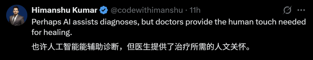 也有人感叹,「也许AI能辅助诊断,但医生提供了治疗所需的人文关怀。」