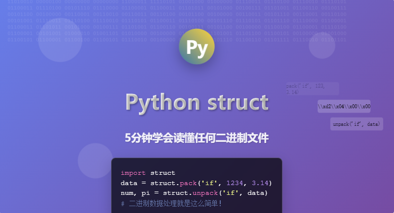 你知道吗?计算机里的所有文件,不管是图片、音频、视频还是游戏存档,本质上都是一堆0和1组成的二进制数据。而struct库就能帮我们把这些看不懂的二进制数据,转换成我们能理解的数字、字符串等。