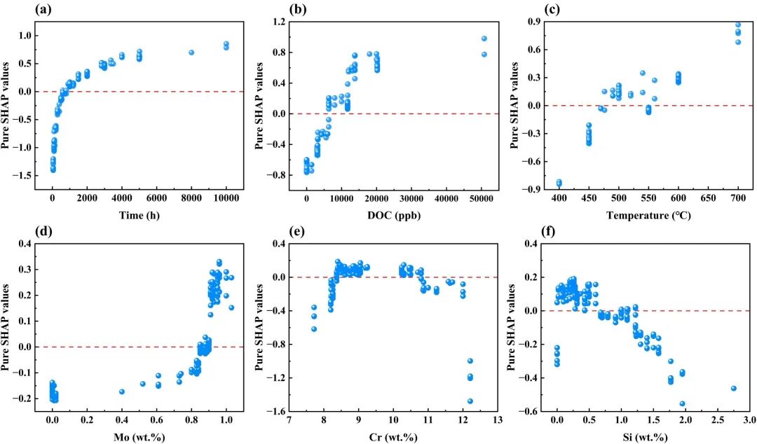 图-4 SHAP分析中对F/M钢在LBE中氧化腐蚀行为影响最大的前六个特征及其独立贡献