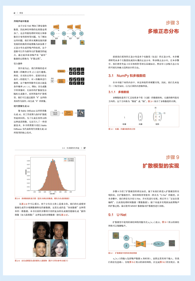 全书以连贯故事形式,通过 10 个步骤,依次讲解与生成模型相关的重要技术,比如正态分布、最大似然估计、多维正态分布、高斯混合模型、EM 算法、神经网络、变分自动编码器,最后用 3 个步骤剖析扩散模型的理论、实现与应用。