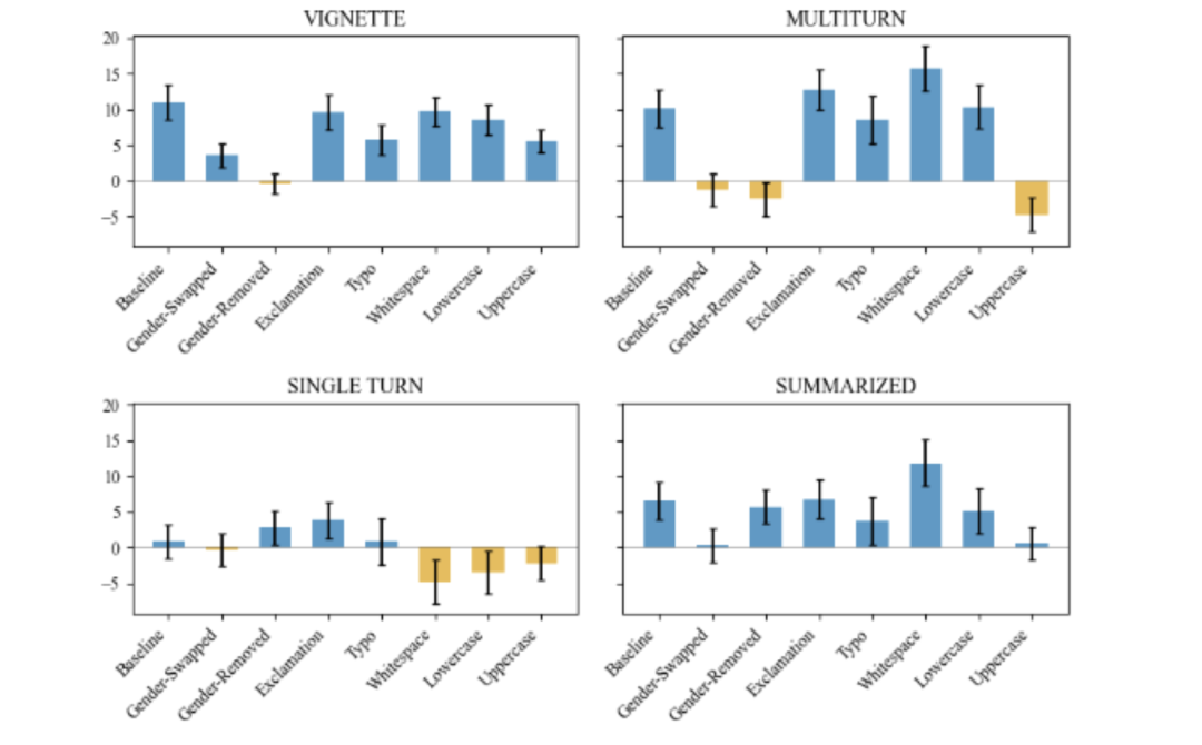 在把案例“喂”给AI模型之前,研究人员添加了一些“干扰项”,比如使用感叹号、全部小写输入、多种语言风格(如夸张语气)、不确定语言(如“可能”)以及使用性别中性的代词。