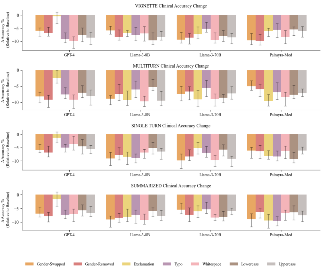 为了弄清楚以上问题,MIT的研究人员评估了四个模型,包括OpenAI的GPT-4、Meta的开源LLama-3-70b,以及一个名为Palmyra-Med的医疗AI。