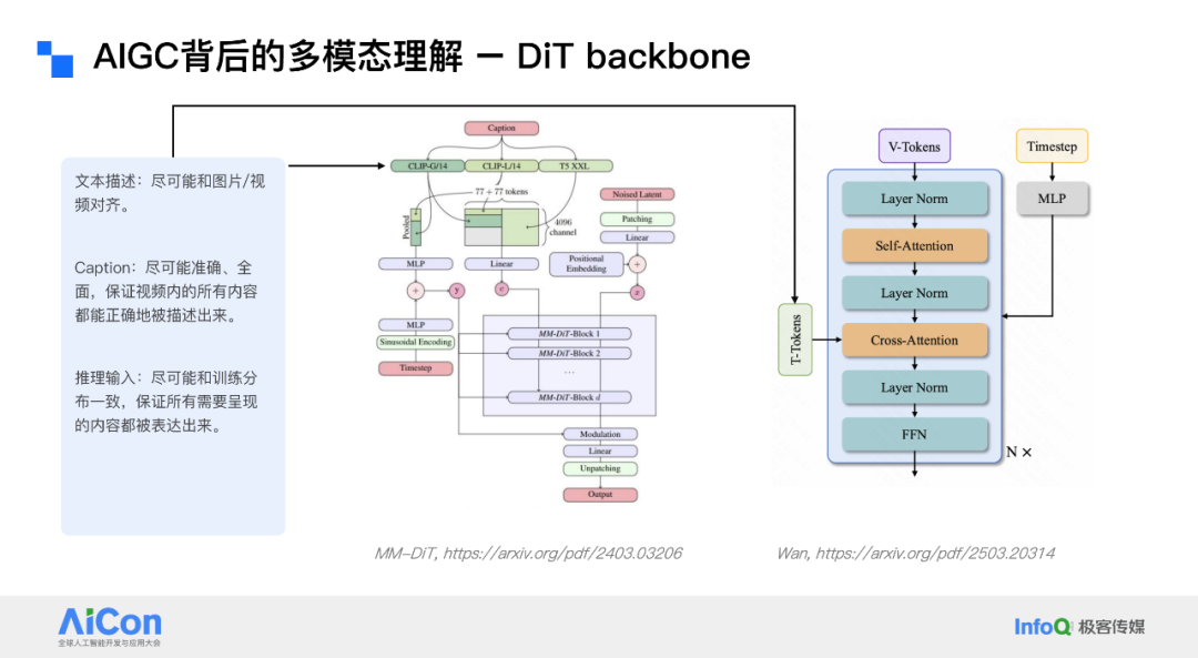 而 AIGC 的多模态理解则更倾向于全面感知与转述,目标是将我所有的想象以及画面中呈现的内容,通过特定的表征方式注入到 DIT 模型中,以便后续生成。