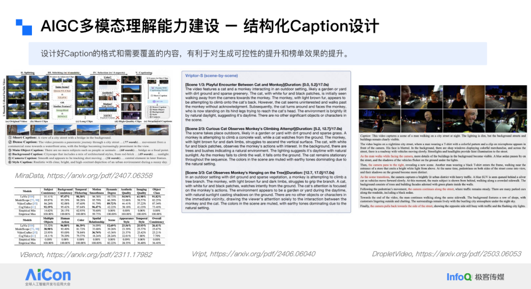 除了这三种格式,还有一个名为 Vbench 的视频 AIGC 榜单。从评测的角度来看,如果我们在设计 Caption 时能够全面覆盖榜单中提到的各种要素,如主体一致性、背景一致性等,那么在 Vbench 榜单上就更有可能取得好成绩。这进一步证明了 Caption 设计的重要性,它并非随意编写,而是需要精心构思。