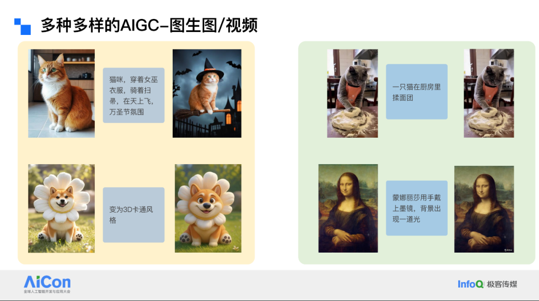 在当今的 AIGC 领域,我看到了一些典型的应用和产品形态。以下图为例,左边是一个静态图,通过输入一段详细的文本,就可以生成一幅有趣的图像。目前,其语义响应能力已经较为出色。