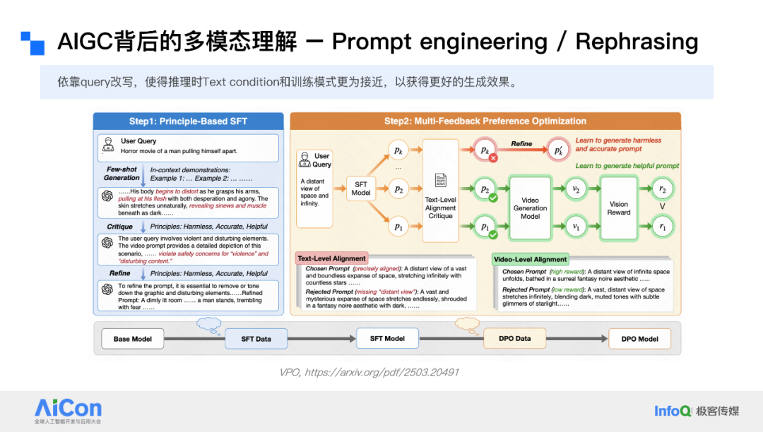 这同样涉及到了之前提到的 Reward Model,用于自动化地评估模型在给定规则下是否能够接收输入并产生优质的视频。通过视频反馈和文本反馈相结合,我们可以将 Query 改写模块训练到一个较好的状态。这在整个文生视频体系中是一个非常关键的环节。