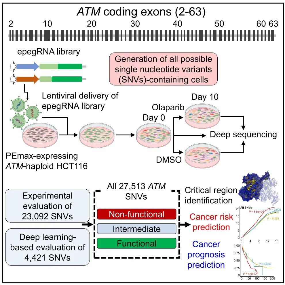 撰文 | 木兰之枻 大规模平行测序推动了遗传诊断的飞速发展,然而测序发现的众多意义未明变异(VUSs)仍是临床遗传学面临的重要挑战。这其中如何对ATM和BRCA1/2等大型基因的VUSs进行饱和高通量功能分析是当前亟待解决的关键难题【1】。ATM基因编码的蛋白是DNA损伤应答(DDR)通路的核心调控因子和重要抑癌因子,在维持应激条件下的细胞稳态中发挥关键作用。ATM基因的纯合致病性变异会导致共济失调毛细血管扩张综合征(A-T),而致病性杂合变异则会导致多种癌症风险增加。因此,ATM基因的遗传筛查在高风险人群和肿瘤常规筛查中都非常重要。除此之外,ATM功能缺失状态也被用于指导临床治疗:例如PARP抑制剂奥拉帕利(Olaparib)已被批准用于治疗携带ATM等同源重组修复基因缺失的转移性去势抵抗性前列腺癌【2-3】。综上可知,对ATM基因所有单核苷酸变异(SNVs)进行功能评估,在癌症风险预测、A-T疾病诊断、癌症治疗方案指定以及患者预后等方面均有非常重要的临床意义。目前而言,
