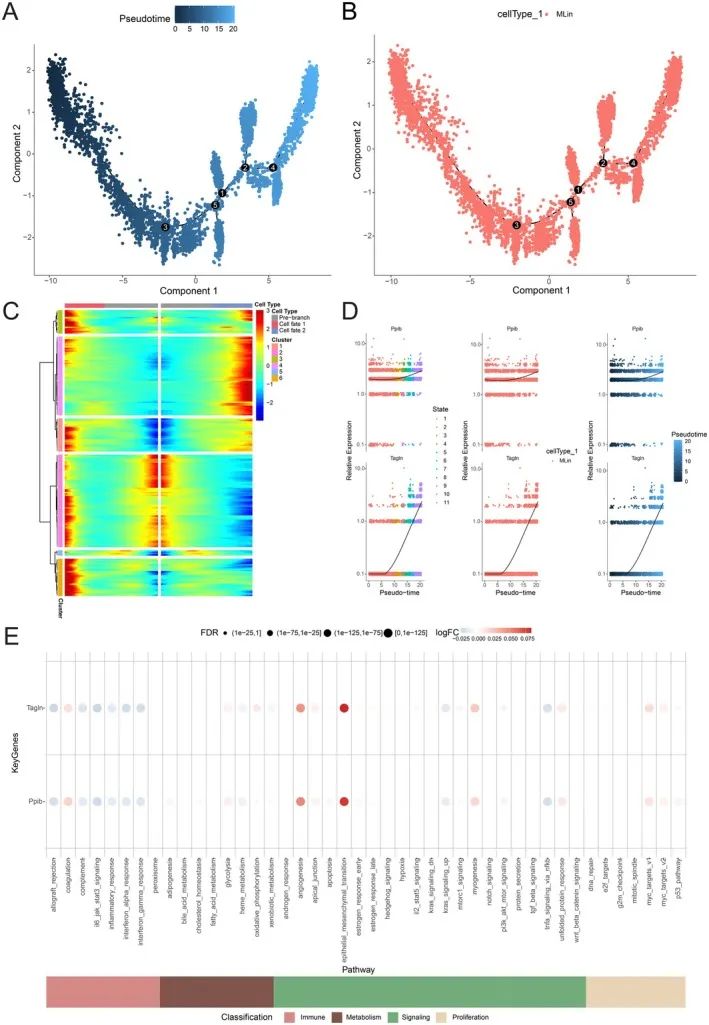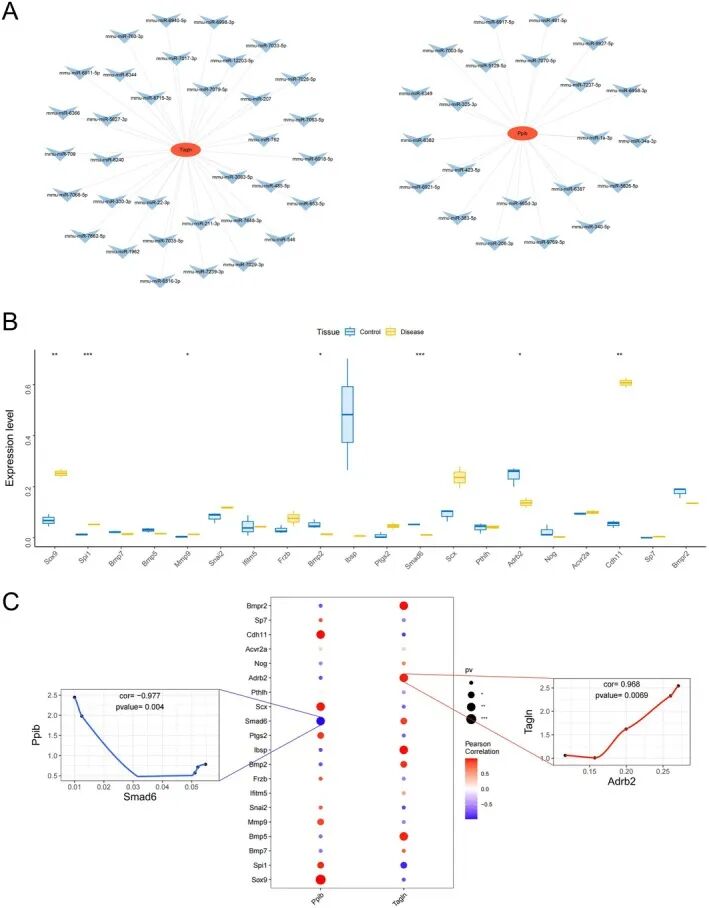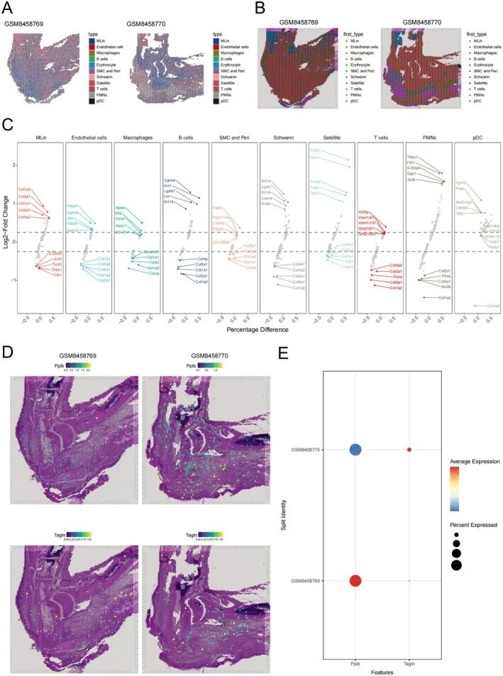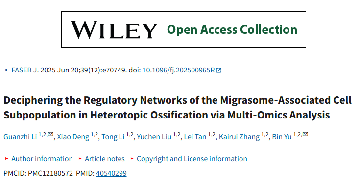 本研究通过单细胞转录组学的迁移体评分分析,确定了 MLin 是异位骨化进展过程中的关键细胞亚型。随后,利用 hdWGCNA、RF 算法及临床样本数据集验证,Ppib 和 Tagln 被鉴定为参与异位骨化的关键分子。整合 bulk transcriptome 进行免疫浸润、miRNA 网络、共表达网络、转录因子调控网络及信号通路分析,从而阐明异位骨化发生发展背后的潜在调控机制。此外,空间转录组学进一步揭示了细胞亚型分布的空间模式及关键基因表达。最终,实验验证表明 Ppib 和 Tagln 表现出与异位骨化进展相关的动态表达模式。这些发现为未来异位骨化的临床诊断和治疗策略提供了新的启示和有前景的方向 。对这篇文章感兴趣的老师,欢迎扫码咨询!