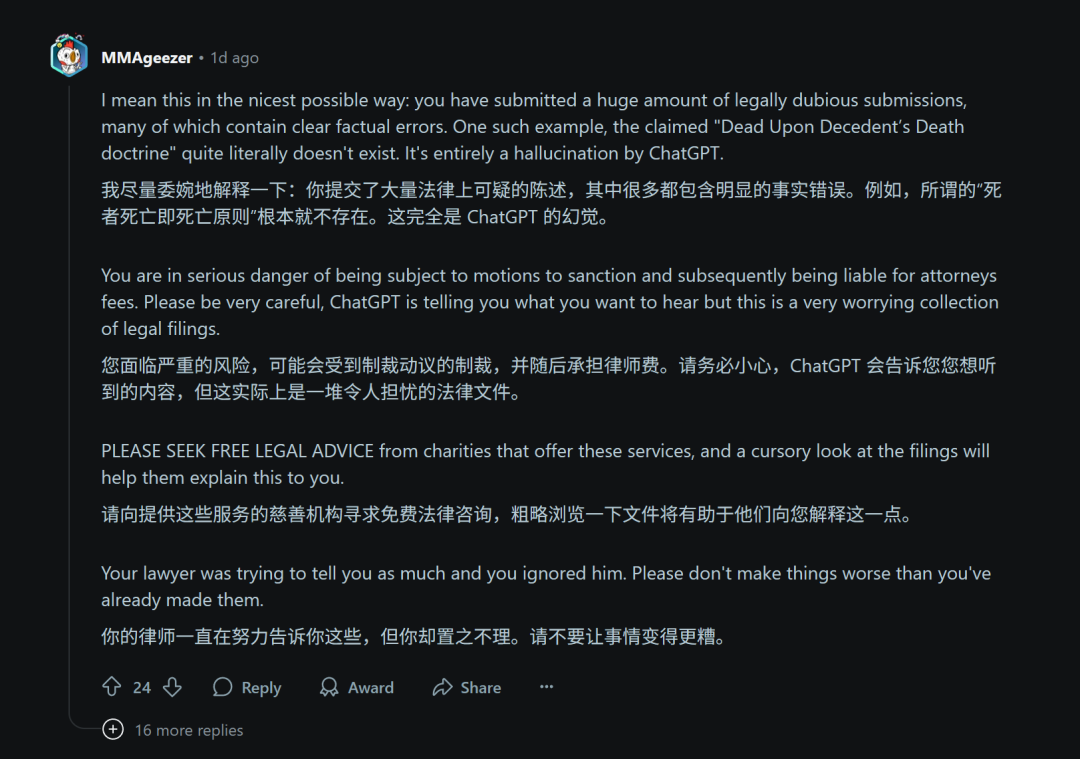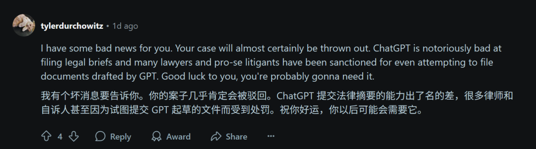 毕竟互联网还有记忆,大家还记得那些因不当使用ChatGPT起草法律文件而受到处罚的例子。