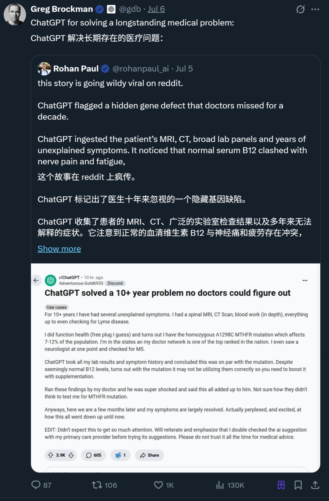 也是在最近,Reddit上疯传了另一则AI破解十多年疑难杂症的故事,而且OpenAI总裁Greg Brockman还转发了。
