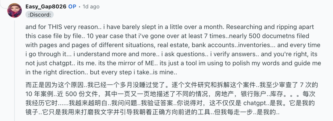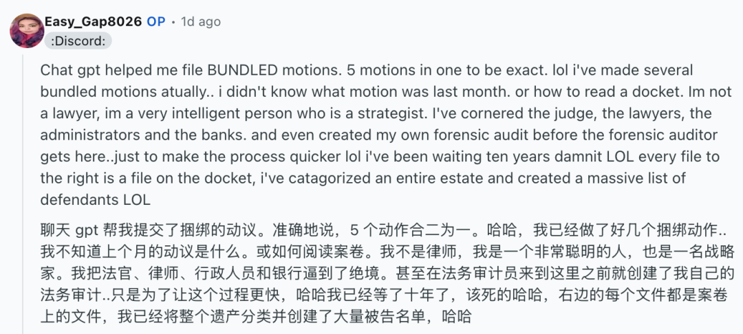 Rejeana表示,在上个月前她还对法律知识一无所知,也不知道如何阅读案件卷宗,所幸有ChatGPT协助,现在她自己就完成了法务审计。