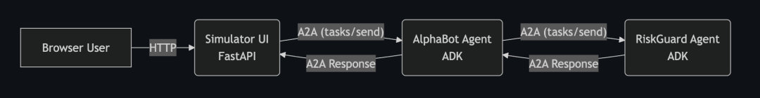 纯粹用于展示交易员(AlphaBot)和风控(RiskGuard)两个独立模块如何通过谷歌的 ADK 和 A2A 协议进行交互。