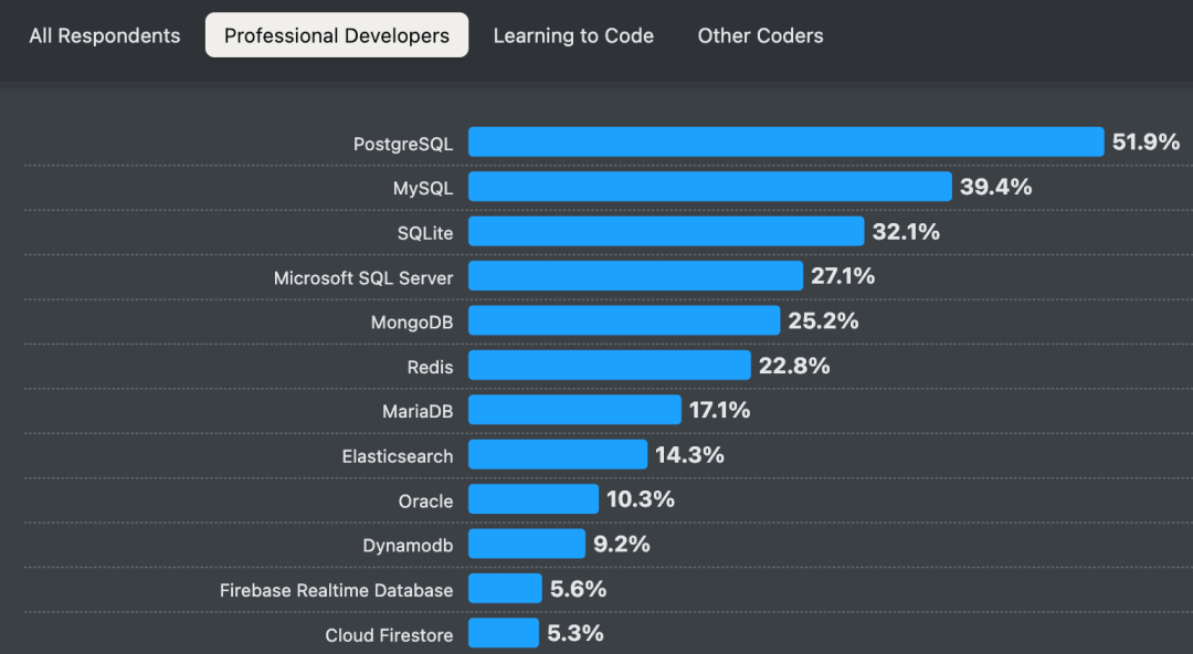 对于专业开发者,PostgreSQL 进一步拉开了和 MySQL 的差距,高出 12%!