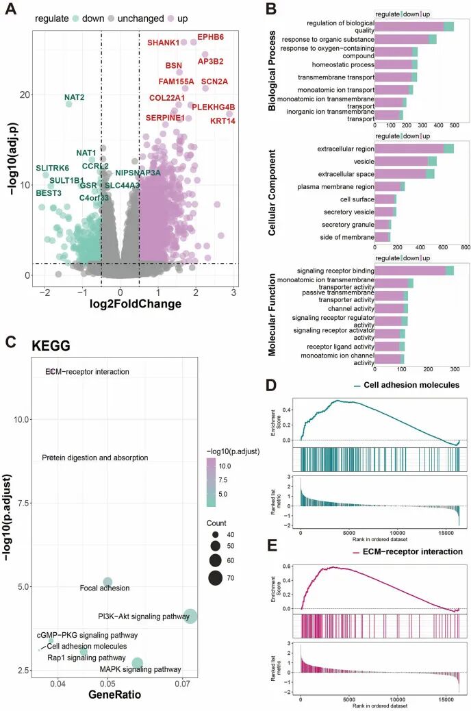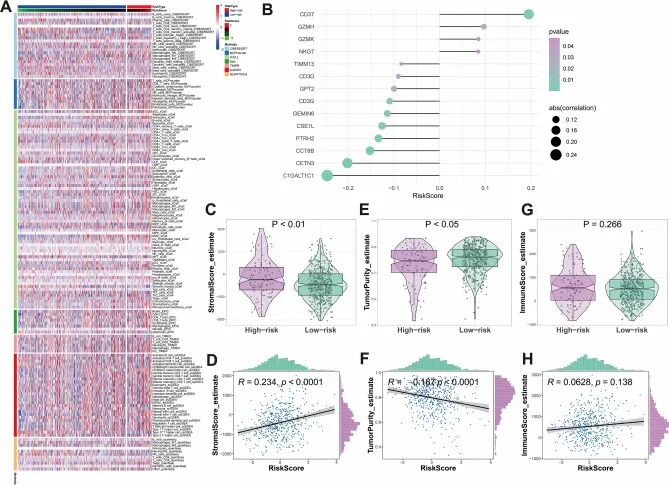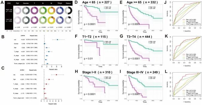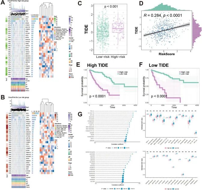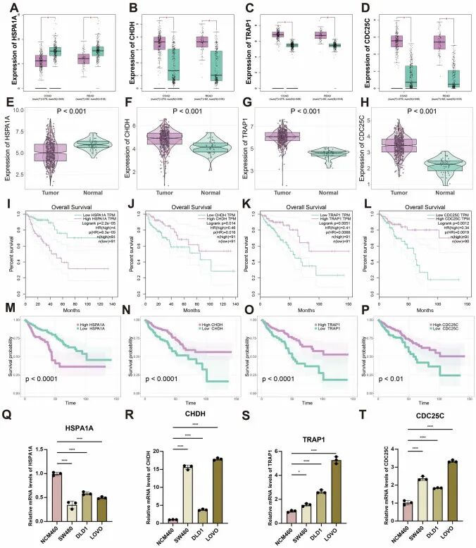 在 TCGA 队列中,作者进一步识别出高风险组和低风险组之间存在 2144 个差异表达基因,其中 1897 个基因上调,247 个基因下调(图 4 A,补充文件 3 S1)。随后,作者对这些基因进行了 GO(图 4 B,补充文件 3 S2)和 KEGG(图 4 C,补充文件 3 S3)分析。作者发现这些基因在 KEGG 分析和 GSEA 中均显著富集于细胞粘附分子通路和细胞外基质受体相互作用通路(图 4 D, E,补充文件 3 S4)。高风险组和低风险组差异表达基因的功能富集分析。A 差异表达基因的火山图。B GO 富集分析的柱状图。C KEGG 富集分析的气泡图。D、E GSEA 富集分析作者比较了高低风险组之间的临床因素差异,结果显示两组在 T 分期、N 分期、M 分期、肿瘤分期和生存状态方面存在显著差异(表 1 ;图 5 A)。作者对临床因素进行了单因素 COX 回归分析,结果揭示风险评分、年龄、T 分期、N 分期、M 分期和肿瘤分期与结直肠癌预后存在显著关联(图 5 B)。随后,作者进行了多因素 COX 回归分析,结果表明风险评分、年龄、T 分期和肿瘤分期是结直肠癌的独立预后风险因素(图 5 C)。作者比较了每个独立预后风险因素在高风险组和低风险组之间的 OS 时间差异,发现高风险组的 OS 时间显著低于低风险组(图 5 D–I)。作者利用独立预后风险因素预测结直肠癌患者 1 年、3 年和 5 年的生存时间,并生成了 ROC 曲线(图 5 J–L)。通过比较 AUC 值,作者观察到风险评分具有最佳的预测性能。比较临床因素差异及列线图构建。A 比较高风险组和低风险组临床因素差异。B 单变量 Cox 回归分析。C 多变量 Cox 回归分析。D–I 高风险组和低风险组独立风险因素生存分析 K-M 生存曲线。J–L 使用独立风险因素预测 1 年、3 年和 5 年生存时间作者利用独立风险因素构建了一个预测 1 年、3 年和 5 年生存率的列线图模型 。ROC 曲线显示,预测 1 年、3 年和 5 年生存时间的 AUC 值分别为 0.801、0.843 和 0.785 。校准曲线结果显示,预测值几乎与实际值重合,表明列线图模型能够很好地预测 1 年、3 年和 5 年生存率 。1 年、3 年、5 年 DCA 曲线的结果表明,始终可以通过遵循列线图模型进行干预来获得最大的净收益 。上述所有结果均表明,作者构建的列线图模型对结直肠癌(CRC)的预后具有强大的预测能力。线粒体相关基因的预后模型风险评分与结直肠癌微环境相关作者采用多种方法分析了高低风险组之间免疫细胞的分布情况(图 6 A)。随后,作者分析了风险评分与 CD8 + T 细胞特征基因表达的相关性,结果显示大多数特征基因的表达与风险评分显著负相关(图 6 B)。ESTIMATE 结果显示,高风险组中基质评分显著较高,且基质评分与风险评分之间存在显著正相关(图 6 C, D)。低风险组中肿瘤纯度显著较高,且肿瘤纯度与风险评分之间存在显著负相关(图 6 E, F)。遗憾的是,尽管结果显示高风险组中免疫评分较高,且免疫评分与风险值之间存在一定正相关,但差异和相关性均未达到显著水平(图 6 G, H)。线粒体相关基因的预后模型风险评分与结直肠癌的肿瘤微环境相关。A 使用多种方法评估两组间免疫细胞的分布。B 风险值与 CD8 T 细胞特征基因表达的关联分析。C、D 分析两组间基质评分的差异以及基质评分与风险评分的关联分析。E、F 分析两组间肿瘤纯度的差异以及肿瘤纯度与风险评分的关联分析。G、H 分析两组间免疫评分的差异以及免疫评分与风险评分的关联分析。(***代表 p < 0.001,**代表 p < 0.01,*代表 p < 0.05,ns 代表无显著性)线粒体相关基因的预后模型风险评分可以预测结直肠癌的治疗敏感性基因突变在一定程度上会导致癌症,因此作者绘制了高低风险组基因突变的水 falls 图(图 7 A, B)。TP53 是一个重要的抑癌基因。当其发生突变时,会导致细胞不受控制地增殖,增加癌症发生和发展的风险。作者发现高风险组的 TP53 突变频率显著高于低风险组,这也可能是高风险组预后较差的原因之一。为了评估样本对免疫疗法的敏感性,作者比较了高低风险组的 TIDE 评分。结果显示高风险组的 TIDE 评分显著高于低风险组(p < 0.001,95% CI [− 0.530, − 0.160])(图 7 C)。此外,相关性分析显示风险值与 TIDE 评分之间存在显著的正相关关系(图 7 D)。综合这些发现表明,高风险组的个体更容易逃避免疫监视,对免疫疗法的反应性降低。 最后,作者比较了高、低 TIDE 组中高、低风险组之间的总生存期,结果显示高风险组的 OS 时间始终显著短于低风险组(图 7 E, F)。作者利用 CTRTP 数据库和 PRISM 数据库预测对化疗药物的敏感性(图 7 G)。作者发现 PYR-41 和 pentostatin 在高风险组中的 AUC 值显著较低,且它们的 AUC 值与风险评分呈显著负相关。这表明这些药物在高风险患者中表现出更高的敏感性,可能成为该亚组的潜在治疗选择。线粒体相关基因的预后模型风险评分可以预测结直肠癌的治疗敏感性。A、B 高风险和低风险人群中的突变频率前 30 个基因。C 比较高低风险组之间的 TIDE 评分。D TIDE 评分与风险评分的相关性分析。E、F 比较高低风险组之间的总生存时间差异。G 使用 CTRPs 数据库和 PRISM 数据库进行药物敏感性分析。(***代表 p < 0.001,**代表 p < 0.01,*代表 p < 0.05,ns 代表无显著性)筛选后,HSPA1A、CHDH、TRAP1 和 CDC25C 被选为结直肠癌的生物标志物。使用 GEPIA 和 TCGA 数据库进行分析,发现这些靶基因在结直肠癌肿瘤组织和正常组织中的表达水平存在显著差异(图8 A–H),并且高表达组和低表达组之间的总生存期存