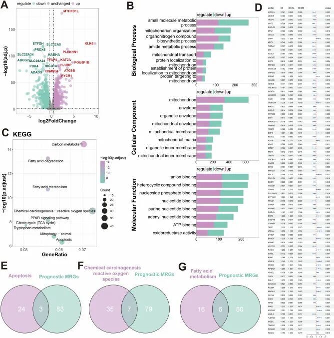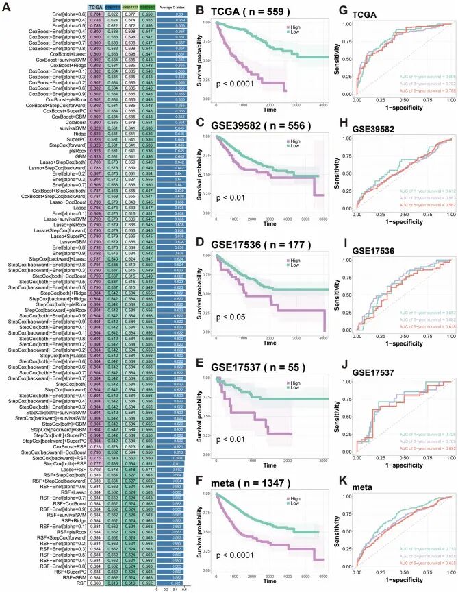 本研究流程图如图1 所示。在 TCGA 训练队列中对 MRGS 进行差异表达分析,共鉴定出 847 个 DEMRGs,其中 449 个上调,398 个下调(图 2 A,补充文件 2 S1)。对 DEMRGs 进行 GO(图 2 B,补充文件 2 S2)和 KEGG(图 2 C,补充文件 2 S3)分析。DEMRGs 的单变量 COX 回归分析显示,共有 86 个 MRGs 与结直肠癌预后显著相关(图 2 D,补充文件 2 S4)。通过将预后线粒体相关基因与 KEGG 通路基因(图 2 E–G)进行交集分析,作者发现 NOL3、DIABLO 和 DDIT3 在凋亡通路中显著富集,COX5A、UQCRFS1、UQCRC2、SDHB、SLC25A6、NOX1 和 MAPK12 在化学致癌—活性氧通路中显著富集,而 CPT2、SCP2、ACADM、HADH、ACADL 和 ACSL6 在脂肪酸代谢通路中显著富集。 研究结果表明,关键线粒体通路与结直肠癌之间存在密切相关性,这会显著影响结直肠癌患者的预后。与 CRC 预后相关的线粒体相关基因的鉴定。A DEMRGs 的火山图。B GO 富集分析的条形图。C KEGG 富集分析的气泡图。D 单变量 Cox 回归分析的森林图。E 凋亡通路基因与预后相关 MRGs 的交集基因的维恩图。F 化学致癌-活性氧通路基因与预后相关 MRGs 的交集基因的维恩图。G 脂肪酸代谢通路基因与预后相关 MRGs 的交集基因的维恩图线粒体相关基因预后模型对预测 CRC 患者预后具有强性能对于 86 个预后长链非编码 RNA 基因(MRGs),作者使用 10 种机器学习算法构建预后模型(图 3 A)。每个模型分别对 TCGA 训练队列和三个独立的验证队列计算了 C 指数。最终,作者选择了平均 C 指数最高的 Enet 算法[α = 0.6]来构建最佳模型。该模型最终识别出 31 个对 CRC 患者预后有显著影响的 MRGs,包括 ATP2A1、CPT2、HSPA1A、TERT、TAMM41、ABHD6、CDC25C、ACOT11、DNLZ、ABHD4、ACADL、MTUS1、TRAP1、CLYBL、C16orf91、PPARGC1A、PAGE4、P4HA1、NOL3、REXO2、CHDH、TFAP2C、COX19、PPP2CB、DNAJC28、BDNF、MSRA、AGBL4、DUSP18、OSBPL1A 和 RAB3A。每个队列的 K-M 生存曲线结果显示,高风险组的总生存时间显著短于低风险组(图 3 B–F)。在 TCGA 训练队列中,预测 1 年、3 年和 5 年生存时间的 ROC 曲线 AUC 值分别为 0.806、0.792 和 0.798(图 3 G)。在独立验证队列中,第 GSE39582 数据集的 AUC 值为 0.612、0.563 和 0.567(图。 3 H); GSE17536 数据集的 AUC 值为 0.657、0.692 和 0.618(图 3 I), GSE17537 数据集的 AUC 值为 0.726、0.709 和 0.692(图 3 J)。在荟萃队列中,AUC 值为 0.710、0.658 和 0.635(图 3 K)。上述研究结果证明,基于线粒体相关基因开发的预后模型,利用机器学习算法,在预测结直肠癌患者预后方面表现出强大的效能。线粒体相关基因的预后模型在预测结直肠癌患者预后方面表现出色。使用了十种机器学习算法,包括 101 种组合,用于构建预后模型,并计算每个模型中每个队列的 C 指数;B-F 部分用于分析每个队列中高风险和低风险组之间的生存曲线;G-K 部分使用 ROC 曲线预测 1 年、3 年和 5 年的生存时间。