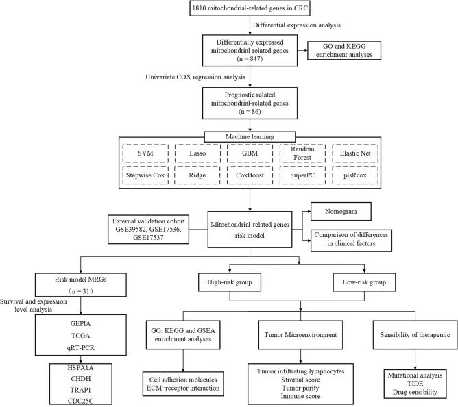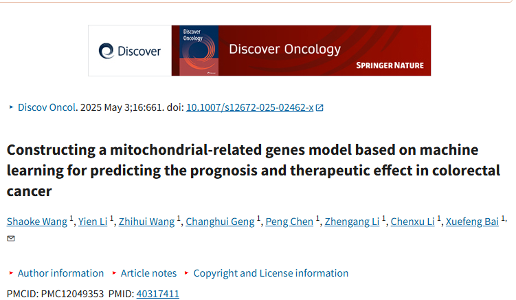 今天给同学们分享一篇文章”Constructing a mitochondrial-related genes model based on machine learning for predicting the prognosis and therapeutic effect in colorectal cancer ”,这篇文章发表在Discov Oncol 期刊上,影响因子为2.9 。