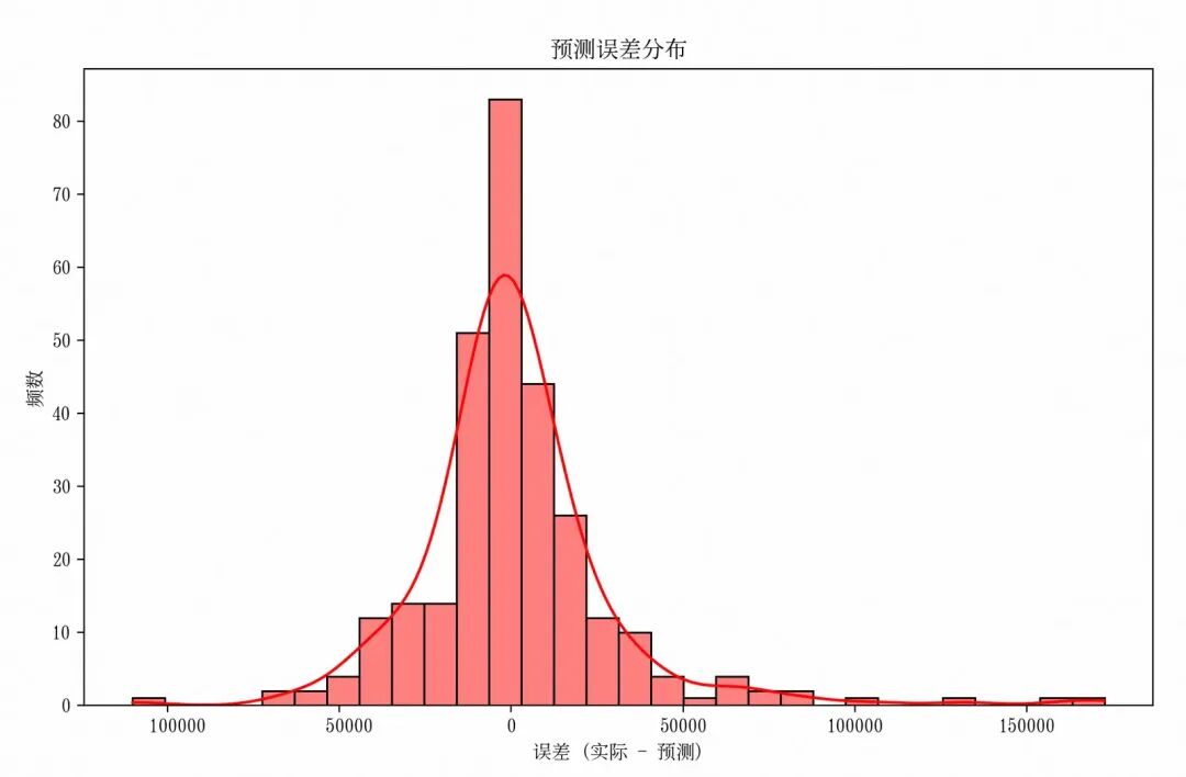 errors = y_val - best_rf_predsplt.rcParams['font.family'] = 'SimSong' plt.figure(figsize=(10,6))sns.histplot(errors, bins=30, kde=True, color='red')plt.title('预测误差分布')plt.xlabel('误差 (实际 - 预测)')plt.ylabel('频数')plt.show()