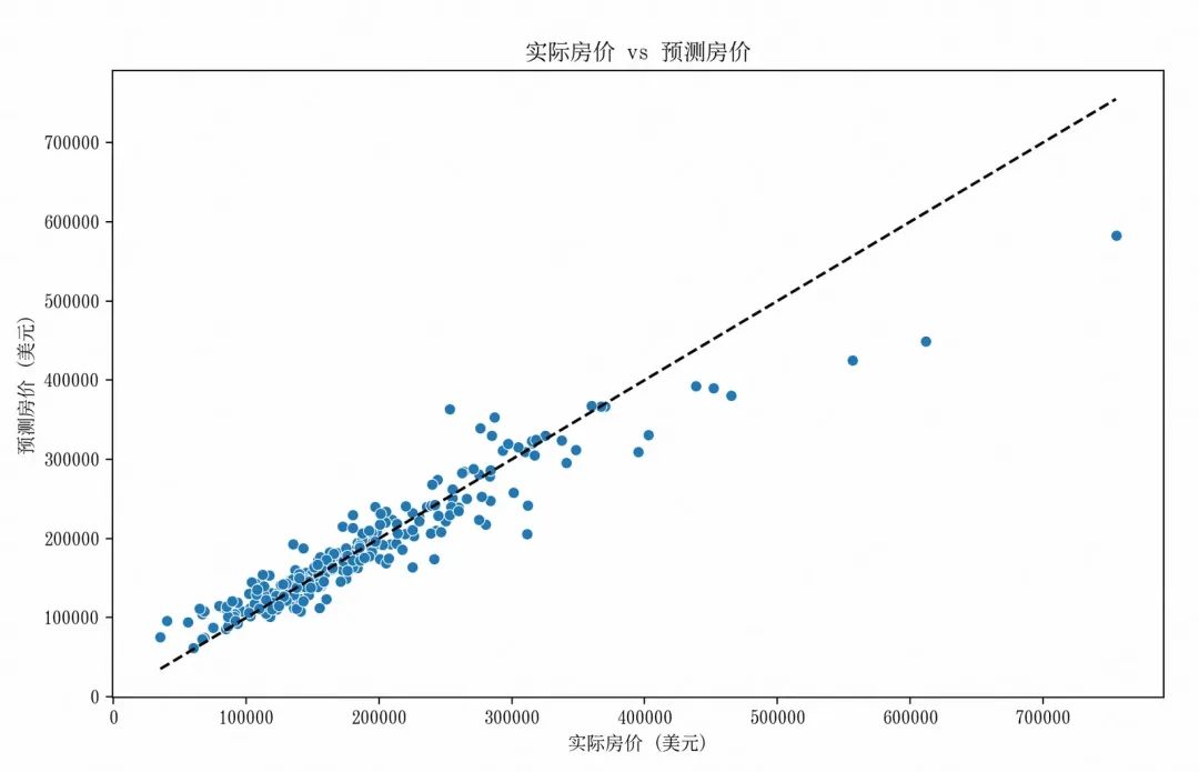 plt.figure(figsize=(10,6))sns.scatterplot(x=y_val, y=best_rf_preds)plt.plot([y_val.min(), y_val.max()], [y_val.min(), y_val.max()], color='black', linestyle='--')plt.title('实际房价 vs 预测房价')plt.xlabel('实际房价 (美元)')plt.ylabel('预测房价 (美元)')plt.show()