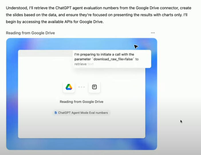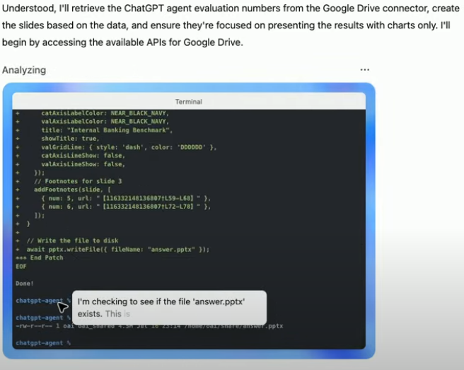 ChatGPT Agent 具备推理能力,能够自动搜索网页,浏览用户的日历,生成可编辑的 PPT,运行代码,甚至可以通过连接 Gmail 和 GitHub 等应用程序来查找与用户提示相关的信息。