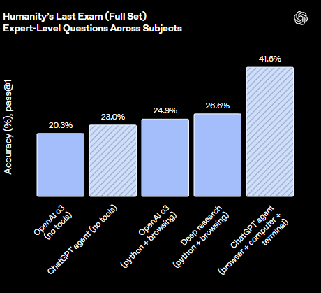 在"人类最后考试"(Humanity's Last Exam)这个困难测试中,ChatGPT Agent 获得了 41.6% 的分数(pass@1)。这个测试包含数千个涵盖一百多个学科的问题,而 ChatGPT Agent 的表现大约是 OpenAI 的 o3 和 o4-mini 模型得分的两倍。