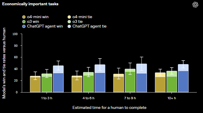 OpenAI 还使用以复杂的现实任务为模型的基准测试对 Agent 进行了评估。在一个旨在评估模型在“复杂且具有经济价值的知识工作任务”表现的内部基准测试中,在大约一半的情况下,Agent 的表现与人类相当或更好,同时明显优于 o3 和 o4-mini。