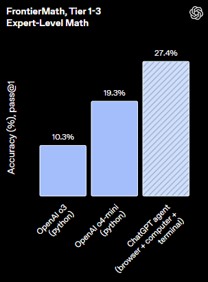 在被认为是最困难的数学基准测试 FrontierMath 中,当 ChatGPT Agent 可以访问工具(如用于代码执行的终端)时,它获得了 27.4% 的分数(Tier 1-3)。