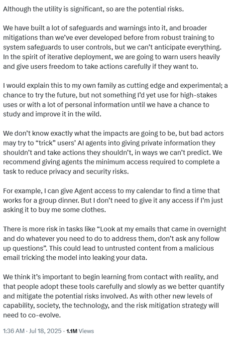 我们在其中内置了大量安全保障和警示机制,并且部署了比以往任何时候都更全面的风险缓解措施,从强化训练、系统防护到用户控制等方方面面都有覆盖,但我们无法预判所有情况。本着迭代部署的原则,我们会向用户发出重点警示,同时给予用户自主选择的空间,让他们可以谨慎地使用各项功能。