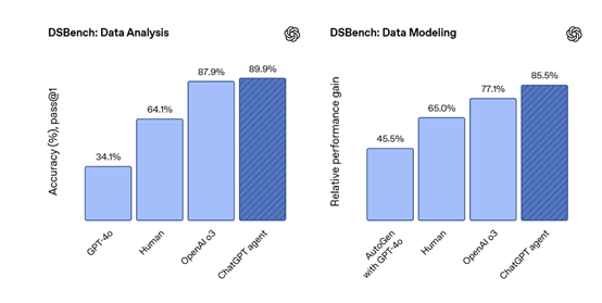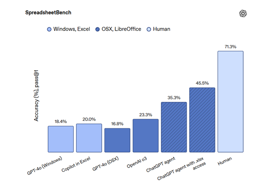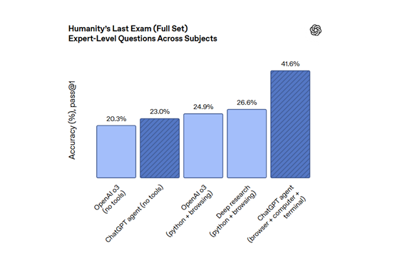 根据OpenAI公布的测试数据显示,ChatGPT Agent 在多项测试中表现优异。在 “人类终极考试” 中,单次尝试通过率达41.6的新SOTA成绩,采用并行策略时分数提升至44.4;在“前沿数学”基准中,准确率达27.4%,大幅超越以往模型。