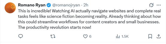 这太不可思议了!看着人工智能真的能浏览网站、完成实际任务,感觉就像科幻小说照进了现实。我已经在琢磨,这能如何为内容创作者和小企业简化工作流程了。生产力革命,从现在开始!