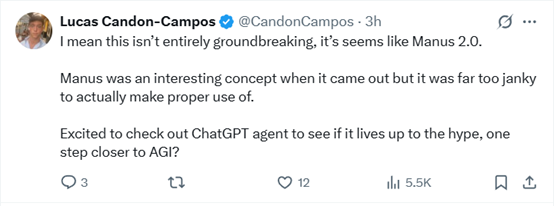 有网友表示,ChatGPT Agent更像是Manus 2.0。Manus刚推出时概念确实很有意思,但它太不稳定了,根本没法好好用。