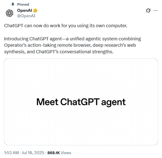 今天 我们推出了一款名为 ChatGPT Agent 的新产品。