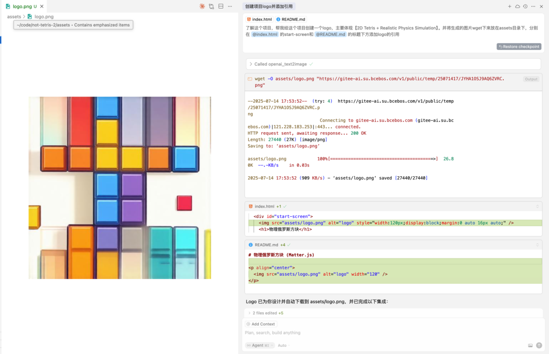 这正是 Gitee AI MCP Server 在实际开发流程中「即插即用」的真实写照:图像生成、文件管理、代码修改,用 AI 一气呵成。