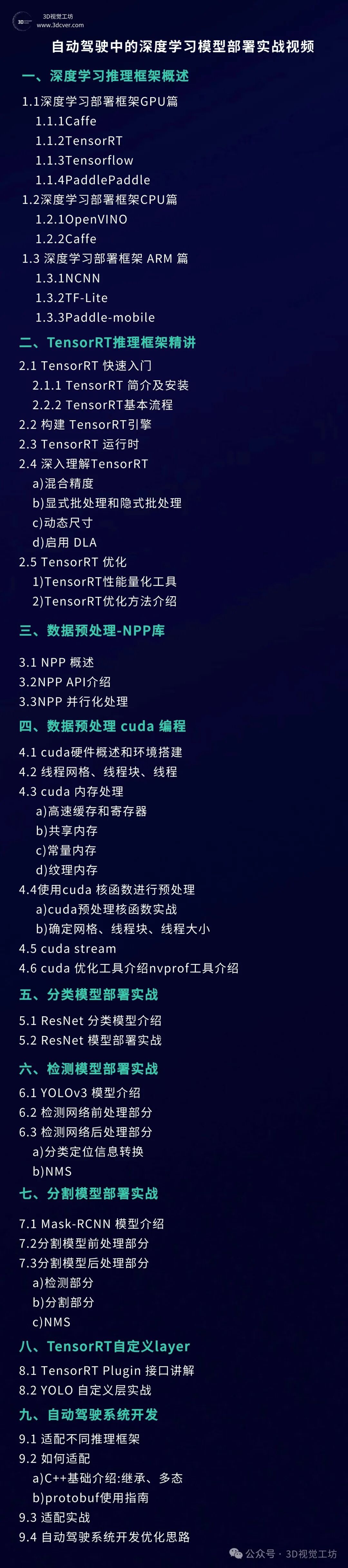 本视频教程将采用理论和实践相结合的思路,首先对TensorRT的编程模型以及GPU/cuda的相关知识进行讲解,带领大家达到知其所以然的程度;之后课程将用分类、检测、分割三个例子来展示详细编程流程,并给出相关代码,达到真正能落地的工业级分享。